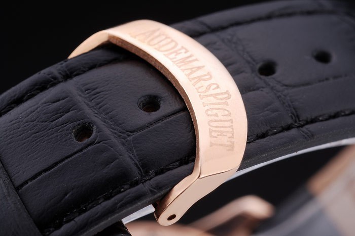 Armband plattiert: Schwarz Krokodillederband mit Wärme geprägt Audemars Piguet Name und das logo und ein Audemars Piguet eingeschrieben 18k Rose vergoldet Flip-Chart Haken clasp