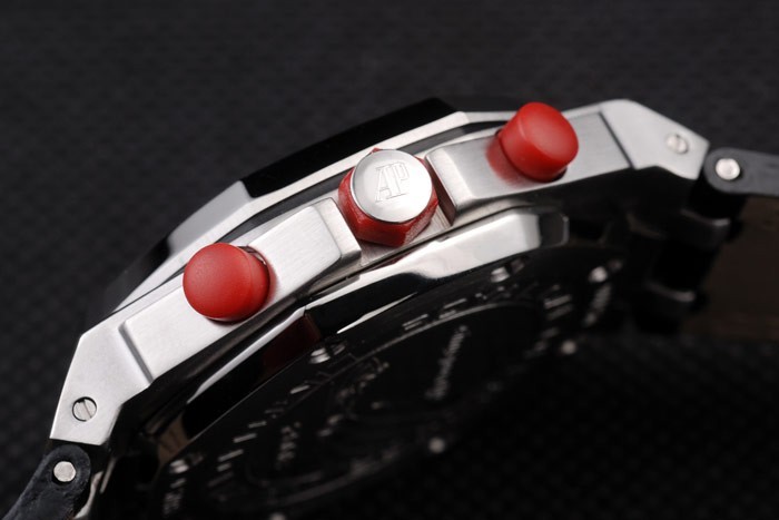 Krone: Rote Gummi hexagonal Krone mit den Initialen AP auf Edelstahlbolzen plus einen roten runden Gummi Krone auf beiden Seiten des it