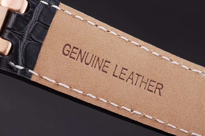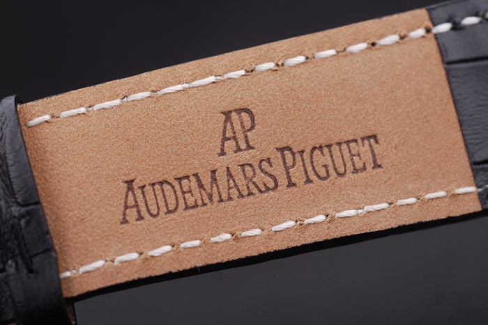 Armband plattiert: Schwarz Krokodillederband mit weißen Fadenheftung und Wärme geprägt Audemars Piguet Name und das logo und ein Audemars Piguet beschriftet rosa vergoldet Flip-Chart Haken clasp