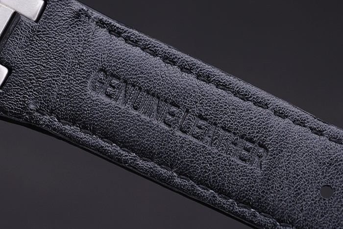 Armband: Schwarz Krokodillederband mit weißen Fadenheftung und Wärme geprägt Audemars Piguet Name und das logo und ein Audemars Piguet beschriftet Edelstahl Flip-über Haken clasp