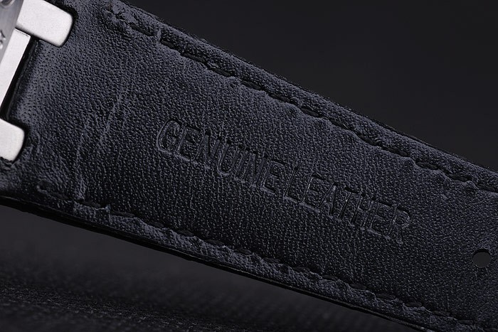 Armband: Schwarz Krokodillederband mit weißen Fadenheftung und Wärme geprägt Audemars Piguet Name und das logo und ein Audemars Piguet beschriftet Edelstahl Flip-über Haken clasp