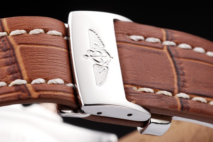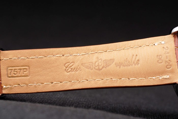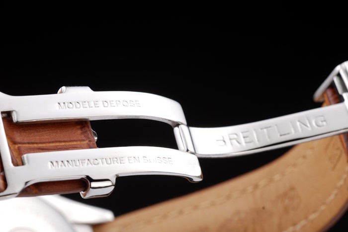 Armband: Brown Krokolederarmband mit Patent weißen Nähten und Wärme geprägt Breitling Gravuren und gravierten Edelstahl falten Gelbgold Indexmarken und graviert Minute markings