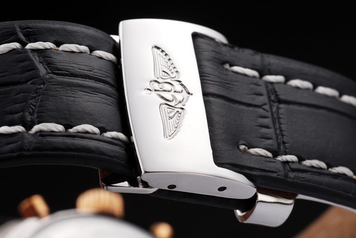 Armband: Schwarzes Krokolederarmband mit Patent weißen Nähten und Wärme geprägt Breitling Gravuren und gravierten Edelstahl falten Verschluss mit Breitling logo auf top