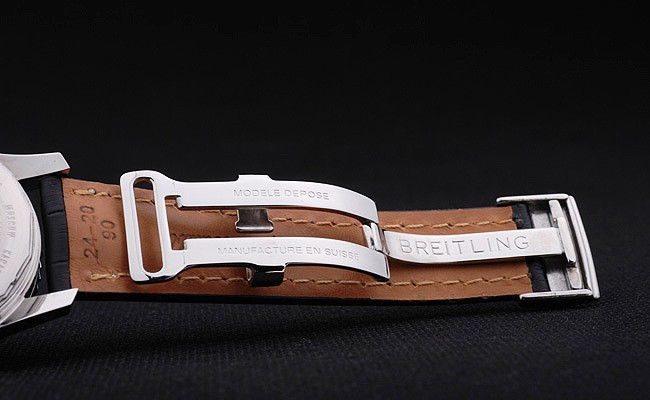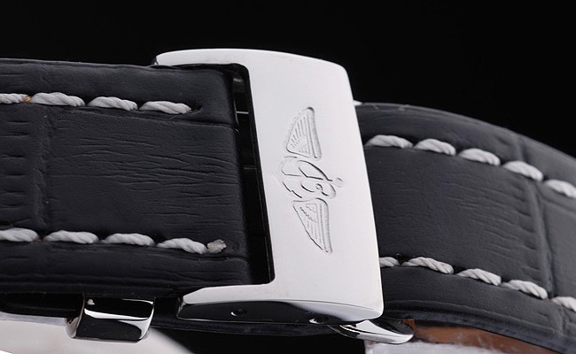 Armband: Schwarzes Krokolederarmband mit Patent weißen Nähten und Wärme geprägt Breitling Gravuren und mit Breitling logo auf top