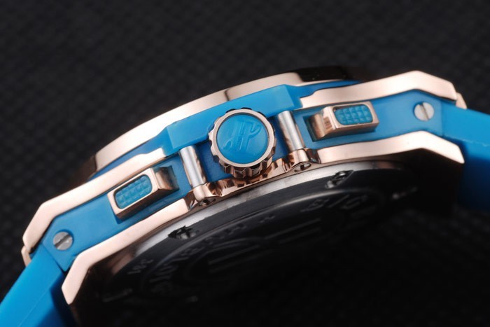 Krone: Cutwork rose-goldene Krone mit ‚H‘ Gravur und zwei rechteckige Druckknopf-Kronen auf beiden Seiten, die alle besetzt mit blauen Gummi trimmings