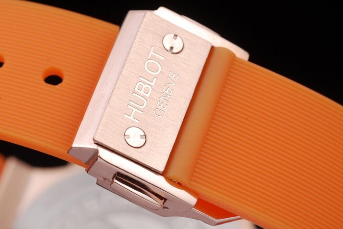 Fall: Strukturierter orangefarbene Gummiband mit Rosen Gold Druckknopfhakenverschluss und Hublot engravings