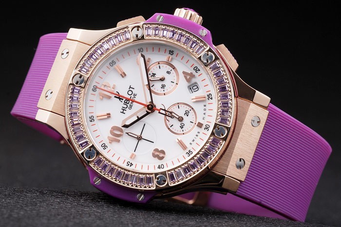 Armband: lila Gummiband mit Rosen Gold Druckknopfhakenverschluss und Hublot engravings