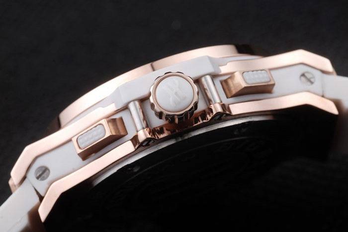 Krone: Cutwork rose-goldene Krone mit ‚H‘ Gravur und zwei rechteckige Druck -Schaltfläche Kronen auf beiden Seiten, alle mit weißen Gummi trimmings