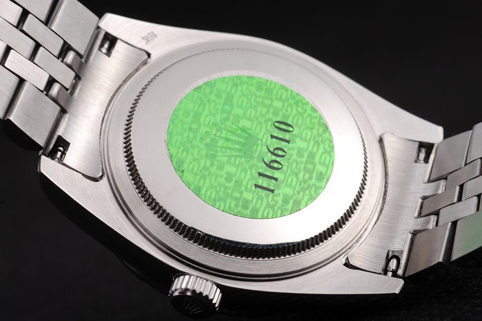 Rückseite: Edelstahl Push-Gehäuseboden mit grünen Rolex-Logo stamp