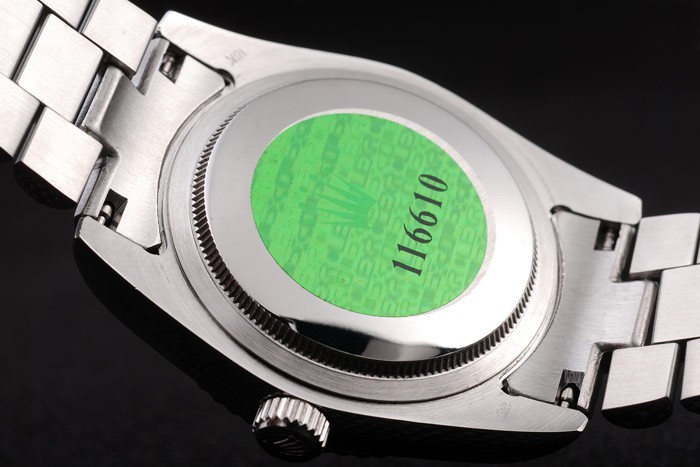 Rückseite: Edelstahl Push-Gehäuseboden mit grünen Rolex-Logo stamp