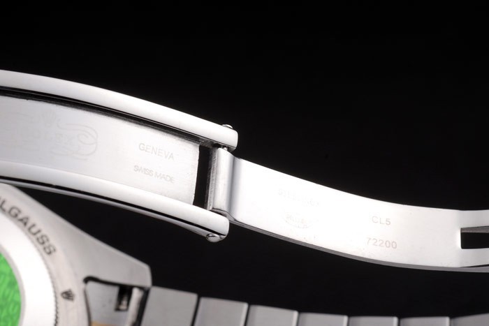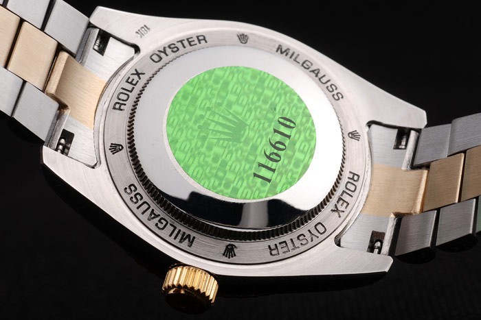Rückseite: Edelstahl Push-Gehäuseboden mit grünen Rolex-Logo Stempel und Rolex Oyster Milgauss engraving