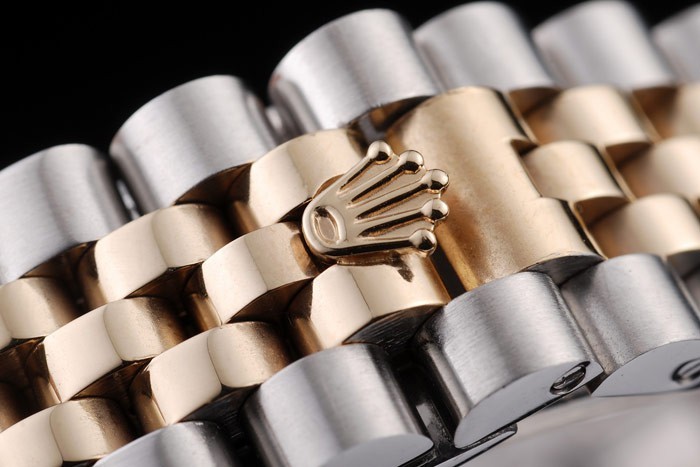 Armband: Zwei getönten Armband Link in gebürstetem Edelstahl und 18 Karat Gelbgold überzogenem Stahl mit Rolex graviert versteckte Spange Anzeigen der Rolex logo
