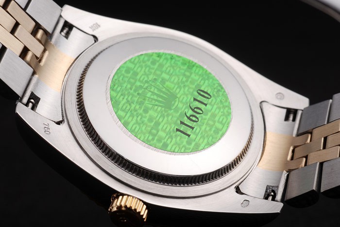 Rückseite: Edelstahl Push-Gehäuseboden mit grünen Rolex-Logo stamp