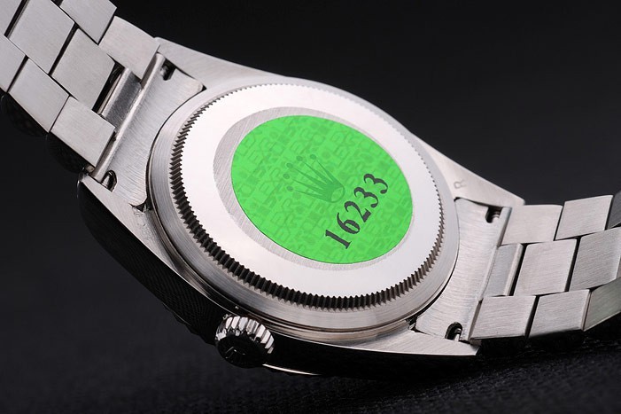 Rückseite: Edelstahl Push-Gehäuseboden mit grünen Rolex-Logo stamp