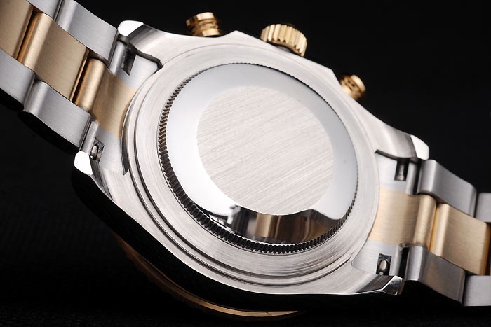 Armband: Edelstahl gebürstet und Rose-Gold-Gliederarmband mit Rolex Gravur im Inneren des Faltschließe und Rolex-Logo auf top